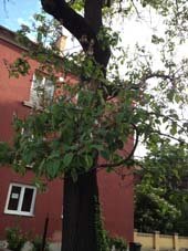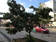 A következő fát, még akkor fedeztem fel, amikor ideköltöztem és sokat jártam vásárolni a Skála alsó szintjén található Kaiser’s áruházba. (Autóval: bekanyarodik, leparkol, parkoló automatát keres, huszast ad az előtte parkoló csövesnek, hogy a többi aprópénzért megvehesse a parkoló jegyet.) Ha mindezzel megvan az ember, akkor az épületet megkerülve, szintén a beton rengeteg közepén, ízléses négyzet alakú járólapokkal kirakott kis nemistudomhogymineknevezzemben, kis négyzetnyi földbe beszorítva megláthatja az ott álló csodálatos birsalma fát. Ami először is lenyűgözött benne annak idején, hogy vajon ki lehetett, aki mindenféle egzotikus dísznövény helyett, vette a bátorságot és egy birsalmát ültetett a város közepére. Persze lehet, hogy magától telepedett be ide és vészelt át hosszú időszakot, amíg ilyen nagyra megnőtt. Sajnos nem tudom a pontos történetét, de aki látott már birsalmafát tudja, hogy talán első ránézésre nem a legcsábosabb, azonban nagyon is sok apró finom részletet fedezhetünk fel rajta, ha kellőképpen szemügyre vesszük. Szeretem például, hogy foltos a törzse, a levelei kerekek és enyhén szőrőskések, a hátoldalukon, a színükön fényes zöldek, a virágai pedig finom rózsaszínek, mintha pillangók ülnének az ágakon.